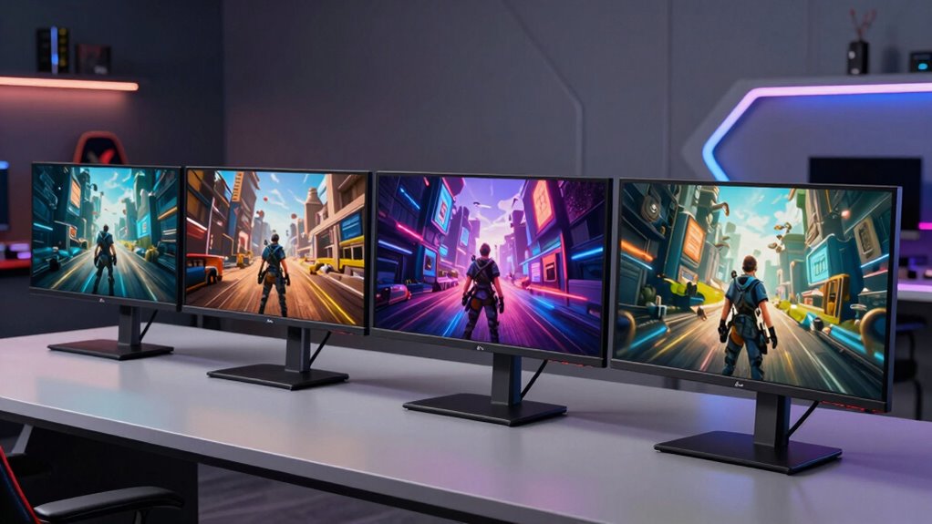 Achieving accurate and vibrant colors is vital if you want your gaming visuals to feel lifelike and immersive. A monitor with high color accuracy ensures true-to-life visuals and precise color representation. Look for screens covering at least 95% of the DCI-P3 color gamut, which delivers rich, vivid colors perfect for immersive gameplay. Additionally, 99% sRGB coverage guarantees consistent hues for realistic visuals, especially in games emphasizing natural tones. HDR support further enhances contrast and color depth, making scenes more vivid and lifelike. Color accuracy is fundamental not only for immersive gaming but also for competitive play and creative tasks, where precise color detail can influence your performance and content quality. Prioritizing these features will greatly elevate your gaming experience.