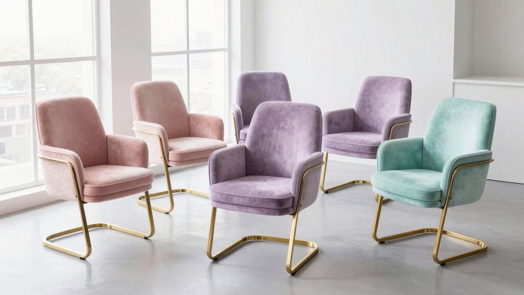 Mobility and flexibility are essential features to take into account when selecting an aesthetic office chair for women, as they directly impact your comfort and productivity throughout the day. A chair with 360-degree swivel capabilities lets you move smoothly and access different parts of your workspace without getting up, boosting efficiency. Adjustable height features are also vital, allowing you to set the seat at the perfect level for your desk and body, reducing strain. Recline and tilt functions give you the freedom to shift positions easily, helping to minimize fatigue during long hours. Smooth-rolling casters or wheels enable effortless movement across various floor types, supporting dynamic work habits. Ultimately, lightweight frames enhance portability, making it simple to reposition or store your chair when needed.