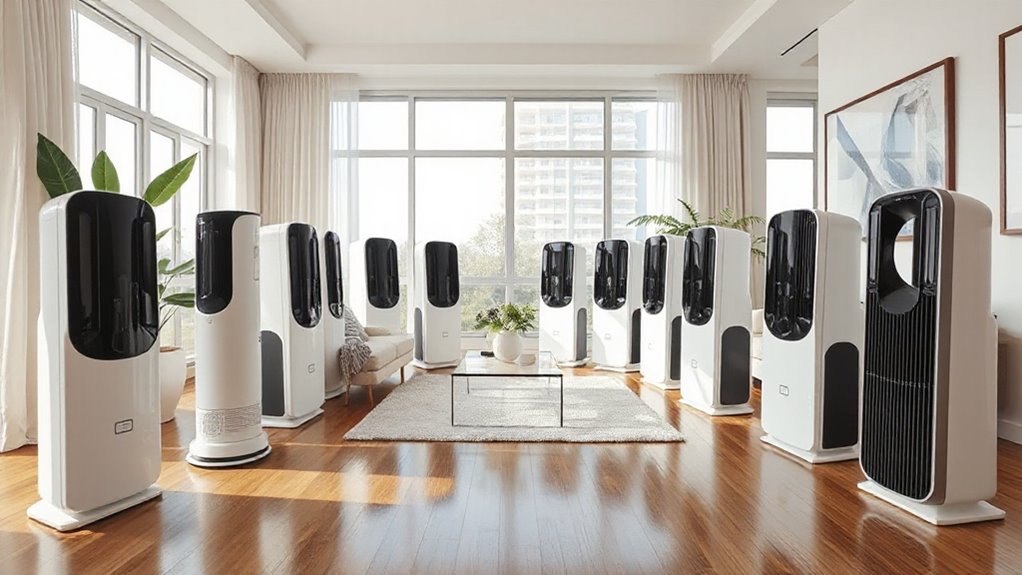 Smart control options are essential features to contemplate when choosing a large room air purifier, as they enhance convenience and efficiency. With WiFi connectivity and app compatibility, you can operate and monitor your purifier remotely, adjusting settings from anywhere. Auto-adjusting fan speeds based on real-time air quality data help optimize purification without manual intervention. Integration with voice assistants like Alexa or Google Assistant allows for hands-free control, making it even more convenient. Smart sensors provide instant feedback on pollution levels, so you know when air quality improves or worsens. Scheduling functions via mobile apps or control panels enable you to set purification times, saving energy and ensuring fresh air exactly when you need it. These features make managing your air purifier effortless and responsive.