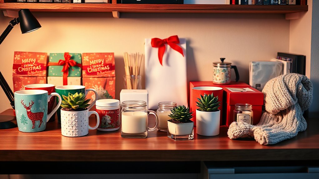 If you’re looking for great Christmas gifts for coworkers under $25 in 2026, I recommend options like practical tumblers, humorous socks, or festive candles. Gift sets such as face masks or notepads add fun and usefulness, while ornaments and monogrammed cups can brighten their space. To make your present extra special, consider thoughtful packaging or personal touches. Keep exploring, and you’ll find even more creative ideas to make your gifts memorable this holiday season.