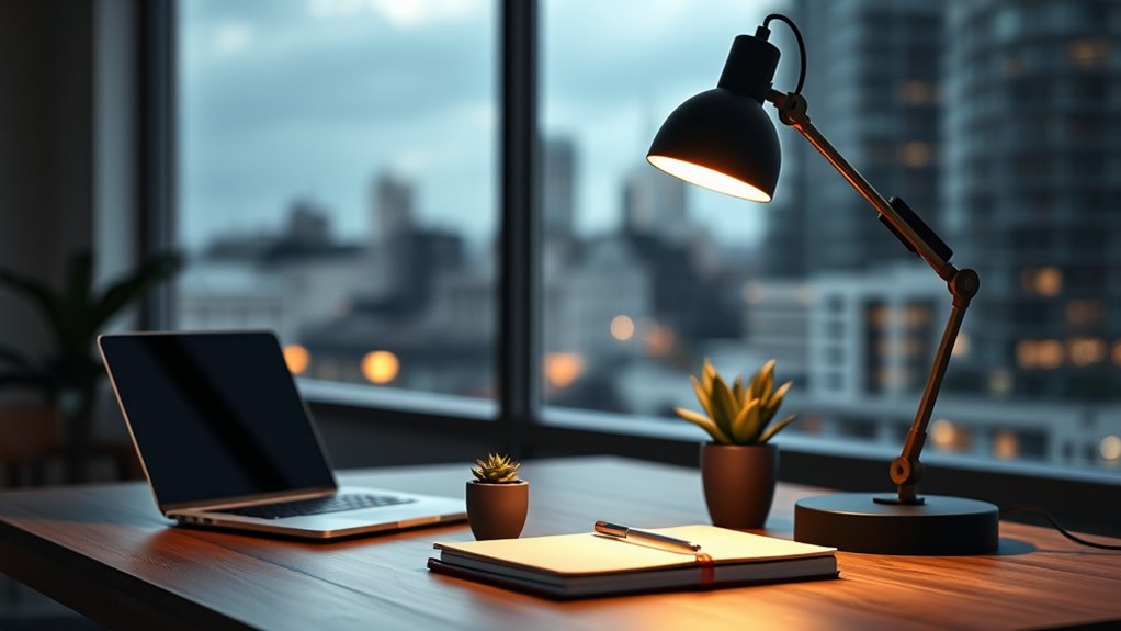 To choose the best desk lamp for eye comfort, I look for adjustable brightness and color temperature settings so I can customize the light to my needs. I prefer lamps with diffusers to avoid harsh glare and guarantee even lighting. It’s also important to pick one with an adjustable arm or height to position the light correctly without straining my eyes. Comfort and flexibility are key for me!