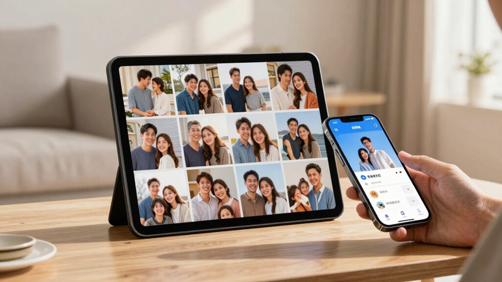 When choosing a digital picture frame with app sharing, the speed at which photos and videos transfer can make a big difference in my experience. Faster sharing means I spend less time waiting and more time enjoying my images. Transfer speeds vary based on WiFi quality and file size, with larger files taking longer to upload. Frames supporting 5GHz WiFi generally offer quicker transfers than those on 2.4GHz networks, which is a big plus. Range is also important; most frames work effectively within a standard 100-foot WiFi range, so I can share from different parts of my home. To guarantee smooth sharing, I look for frames with optimized apps and strong encryption protocols, which help make the process reliable and quick.