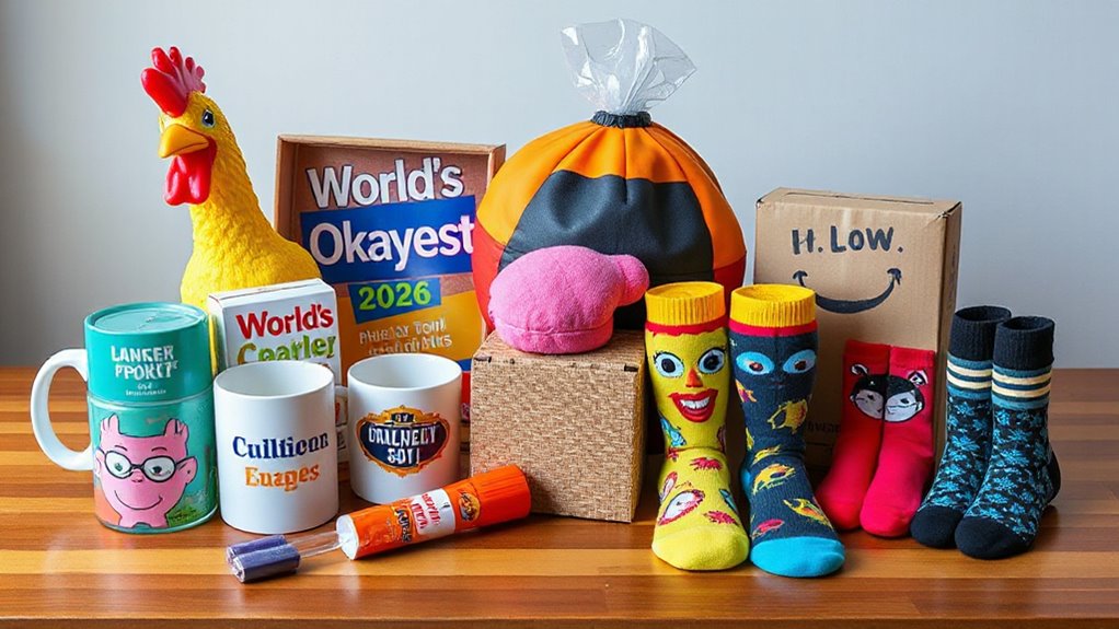 I find that light-hearted, office-appropriate gag gifts work best, like funny stress balls, quirky mugs, or humorous desk signs. I always make sure they’re good-natured and not offensive, keeping the workplace friendly. It’s fun to add a bit of humor without crossing the line. When choosing, I consider the office culture and personalities, ensuring everyone enjoys the joke and has a good laugh.