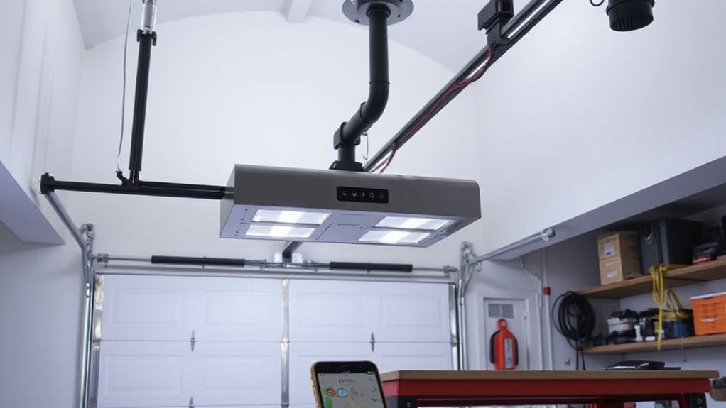 The noise level of a garage door opener can considerably impact your daily comfort, especially if your garage is close to living spaces or bedrooms. Belt drive models are typically quieter than chain drives, making them better suited for such setups. Using advanced noise-dampening materials and insulated panels can further lower operational sounds during opening and closing. The motor’s power and speed also matter—quieter motors tend to run smoothly at lower speeds, reducing noise. Features like soft-start and soft-stop technology help prevent sudden movements that cause loud noises. Proper installation is essential too; securing the mounting and ensuring the door is balanced can minimize vibrations and noise. All these factors combined help keep your garage operation discreet and peaceful.