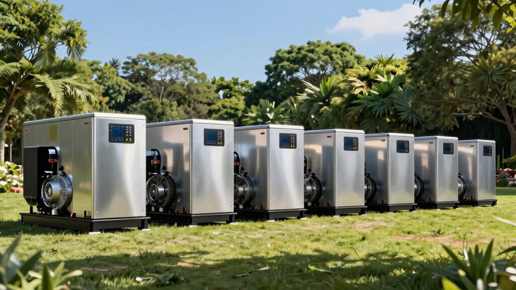 The runtime of a home gas generator is mainly determined by its fuel tank size and how much load you put on it. Larger tanks mean longer operation times, but the actual runtime also depends on the generator’s fuel efficiency. This is often measured by how many hours it can run per gallon of fuel at different load levels, like 25% or 50%. Many modern generators have ECO or economy modes that optimize fuel consumption by adjusting engine speed based on demand, saving fuel and extending runtime. The type of fuel—gasoline, propane, or natural gas—also impacts efficiency, with natural gas and propane offering cleaner burning and potentially longer runtimes. Regular maintenance guarantees the generator runs efficiently and maximizes its operational hours.