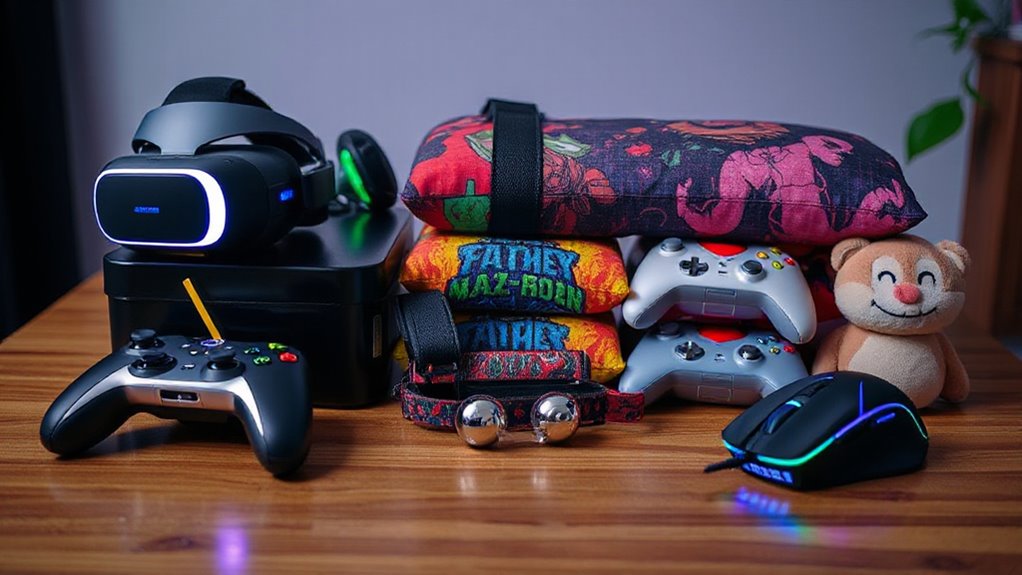Practicality and usefulness are key factors to contemplate when selecting gifts for gamers in 2025, as these items directly enhance their gaming experience. A practical gift should improve comfort, such as high-quality accessories or devices that make gameplay smoother and more enjoyable. Usefulness depends on how well the item serves a functional purpose during gaming sessions, like storage solutions or maintenance tools that keep equipment in top shape. It’s also important to choose items compatible with their existing setup, ensuring seamless integration. Durable, well-designed gifts offer long-lasting value, while items supporting their hobbies outside gaming—like themed apparel or organizational tools—add extra utility. Prioritizing practicality guarantees your gift will be appreciated and used regularly, making it a smart choice for any gamer.
