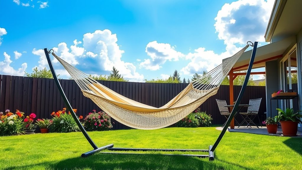 When choosing the perfect hammock with stand, remember that comfort and durability matter most. Did you know that over 60% of outdoor relaxation enthusiasts say investing in a sturdy stand considerably enhances their lounging experience? With so many options available, finding one that supports up to 550 pounds or easily fits your space can turn your backyard into a personal paradise. So go ahead—grab your favorite and start relaxing today!