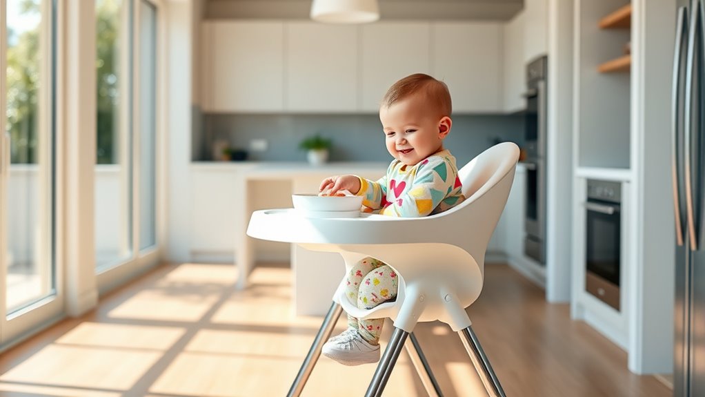 When selecting a high chair, considering its space-saving features can make a big difference, especially if your home has limited room. I look for models with foldable or compact designs that store easily when not in use, perfect for small spaces. Many incorporate removable or stow-away trays to further reduce their footprint. Slim profiles and vertical stacking options help maximize every inch of your kitchen or dining area. Lightweight construction is a bonus, allowing quick repositioning or portability for multi-use rooms or travel. Some high chairs even convert into booster seats or toddler chairs, which means fewer pieces of furniture cluttering your space. Overall, a space-efficient high chair offers convenience without sacrificing safety or comfort, making mealtime smoother and storage simpler.