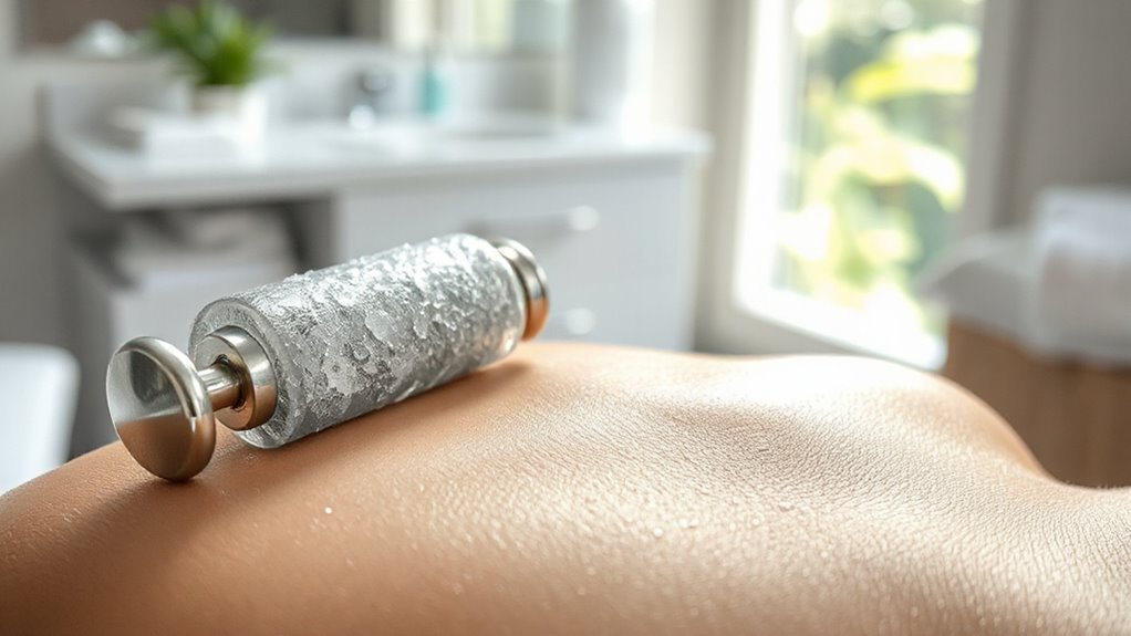 Considering the additional skincare benefits of ice rollers, it’s clear that their role extends beyond just cooling the skin. I’ve noticed they improve blood circulation, which enhances my skin tone and gives me a natural glow. Regular use helps reduce puffiness and swelling, making my face look more refreshed and youthful. The cooling sensation also calms irritated skin, redness, and inflammation, providing immediate relief. Over time, the cold compression can tighten pores and boost skin elasticity, improving overall texture. I’ve found that applying my serums and moisturizers after using an ice roller helps these products absorb better, maximizing their benefits. These extra perks make ice rollers a versatile addition to my skincare routine, enhancing both appearance and skin health.