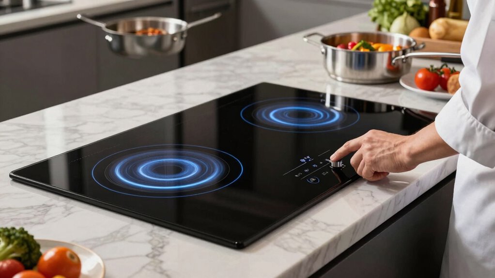When evaluating induction cooktops, it’s vital to take into account their cooking zone flexibility, as this directly impacts how efficiently and conveniently I can prepare multiple dishes. The number of cooking zones determines how many pots or pans I can use simultaneously, boosting overall efficiency. Flexible zones, like adjustable or dual zones, are a game-changer because they accommodate various pan sizes and shapes, ensuring even heat transfer. Bridge zones that connect two smaller zones expand versatility for larger cookware. Independent control of each zone allows me to cook different dishes at different temperatures at the same time, saving me time. Finally, matching zone size and shape to my typical cookware is essential for ideal heat distribution and energy efficiency, making my cooking experience smoother.
