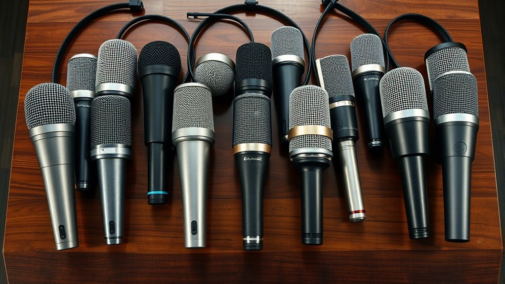 Many large-diaphragm condenser microphones under $200 come with essential accessories like shock mounts, pop filters, and XLR cables, which can substantially improve your recording quality and simplify setup. A sturdy shock mount helps isolate the mic from vibrations and handling noise, resulting in clearer sound. Pop filters are vital for reducing plosive sounds and wind interference, ensuring cleaner vocal recordings. Bundled accessories like adjustable goosenecks and desktop stands offer flexible positioning options, making it easier to find the perfect angle. Additionally, complete starter kits that include all these components provide better value, giving you everything needed for professional-quality recordings without extra purchases. These accessories can make a significant difference in both sound quality and convenience.