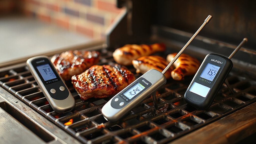 When selecting a meat thermometer for grilling, wireless range plays a key role in how flexible and convenient your cooking experience will be. A longer-range thermometer lets you monitor your meat from a greater distance, sometimes hundreds of feet away, giving you more freedom to multitask or relax without staying near the grill. Different technologies like Bluetooth, RF, or WiFi influence how far the signal can reach, with ranges from about 100 feet to over 1000 feet. A strong, stable connection guarantees you receive consistent temperature updates, even in environments with obstacles or interference. This means you can keep an eye on your meat from inside your house or across a large outdoor space, making grilling more effortless and enjoyable.