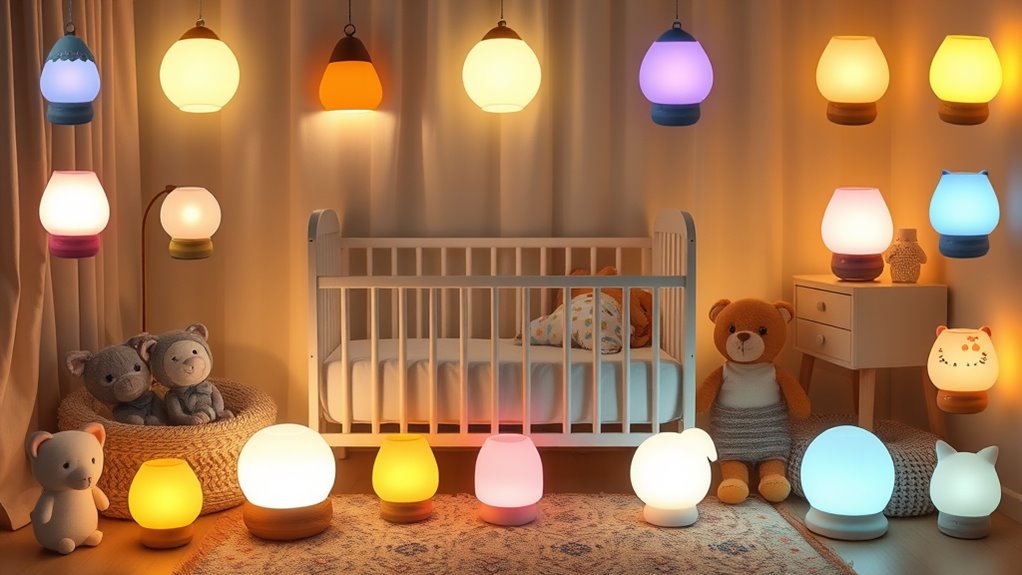 Opting for energy-efficient night lights not only helps cut down on electricity bills but also reduces environmental impact. Lower wattage models use less power, making them more cost-effective over time. LED night lights are particularly efficient, consuming 80-90% less energy than incandescent or halogen options. Many come with adjustable brightness, allowing you to dim the light when full brightness isn’t needed, saving even more energy. Night lights equipped with automatic dusk-to-dawn sensors only turn on when ambient light drops, preventing unnecessary energy use during the day. Typically, energy-efficient night lights operate within 0.3 to 1 watt, making them a smart choice for long-term, eco-friendly use. Prioritizing power consumption efficiency guarantees you enjoy a safe, well-lit space without high energy costs.