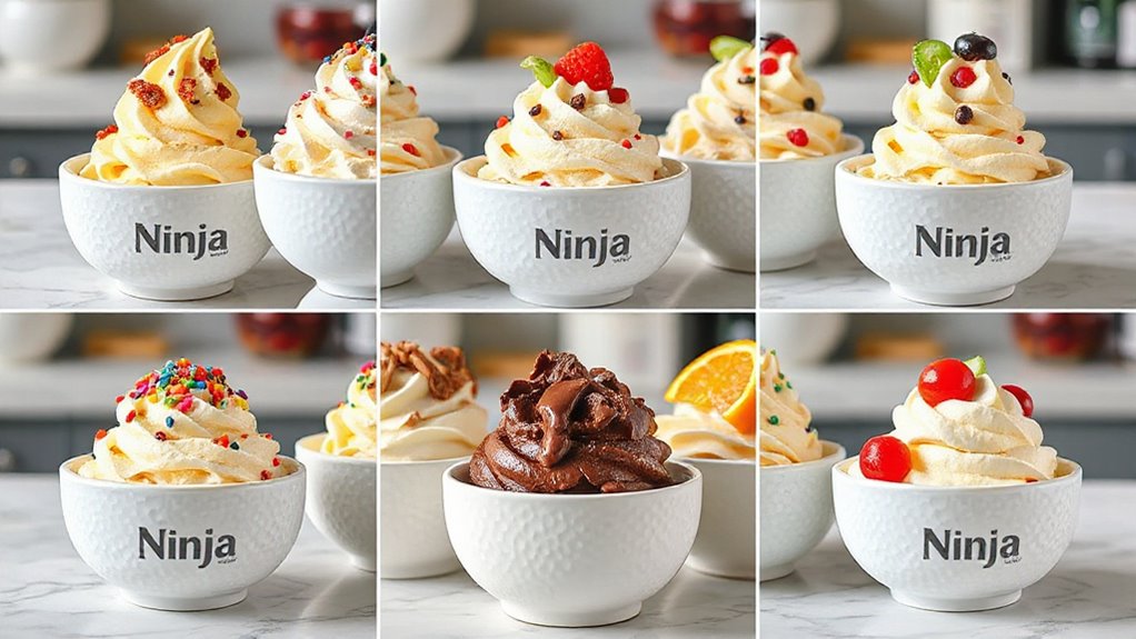 A diverse collection of Ninja Creami Deluxe recipes unlocks a wide array of frozen treats, from creamy ice creams and rich gelatos to invigorating sorbets and smoothies. This variety guarantees I can cater to different tastes and occasions, making my dessert options exciting. Including recipes with various ingredient bases, like dairy, fruit, and plant-based alternatives, provides flexibility for dietary needs and nutritional preferences. The range of flavor profiles, from classic vanilla and chocolate to exotic fruit infusions, keeps things interesting. Plus, recipes with mix-ins like candies, nuts, and chocolates allow for customization and added texture. Access to multiple frozen treat styles helps me utilize all functions of the Ninja Creami Deluxe, boosting creativity and ensuring I get the most out of my machine.