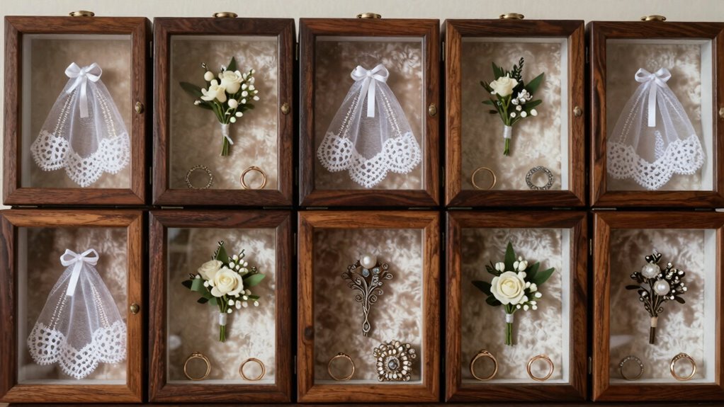 I believe the best materials for preserving wedding memorabilia are acid-free and archival-quality options. Acid-free paper, mats, and tissue prevent yellowing and deterioration over time. Glass or UV-protective acrylic shields protect against sunlight and dust, while acid-free foam or padding supports delicate items without damage. Using these materials helps guarantee your keepsakes stay pristine, allowing you to cherish your special memories for years to come.