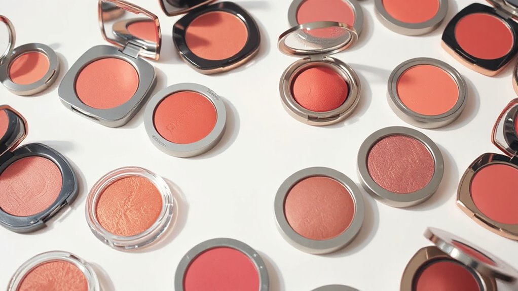 The formula and finish of a blush dupe play a essential role in achieving your desired makeup look and ensuring comfort throughout the day. Different formulas, like cream, liquid, matte, dewy, or hybrid, impact how the blush applies and interacts with your skin. For a natural, radiant glow, I recommend a dewy or luminous finish, while a matte formula offers a velvety, shine-free look. Buildable formulas are great because they let you layer color gradually, giving you control over intensity and longevity. Waterproof or sweat-proof options are ideal if you need your blush to stay vibrant during activities or in humid weather. The finish also affects how your blush blends with powders or highlighters, influencing your overall makeup harmony.