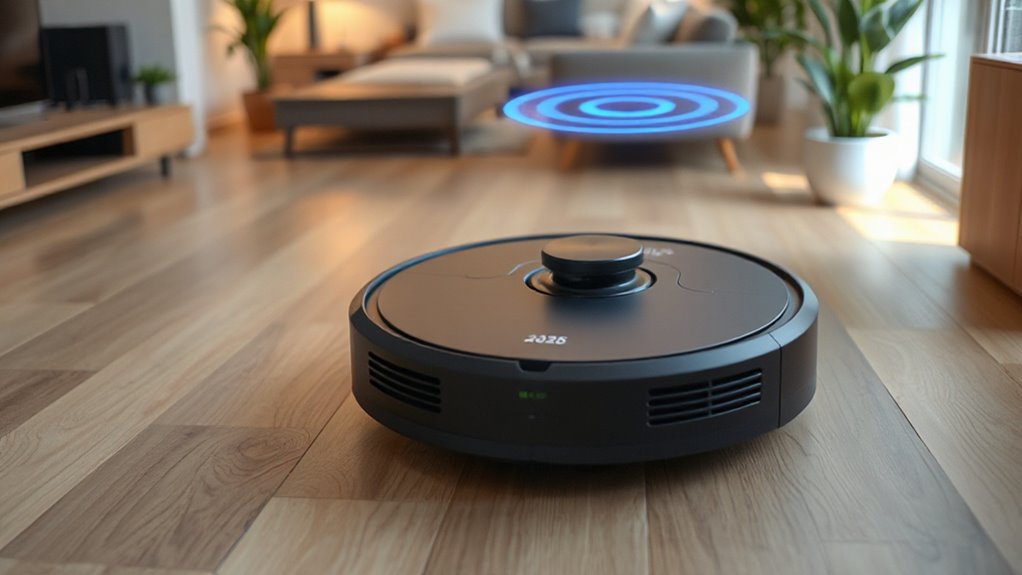 Did you know that lidar sensors can operate effectively in nearly complete darkness? I can confirm that lidar vacuums work exceptionally well in low-light conditions because they use laser pulses, not ambient light, to navigate. This means your vacuum can clean efficiently day or night, without missing spots. I’ve tested several models, and they consistently perform well regardless of lighting, making them reliable for continuous, thorough cleaning.