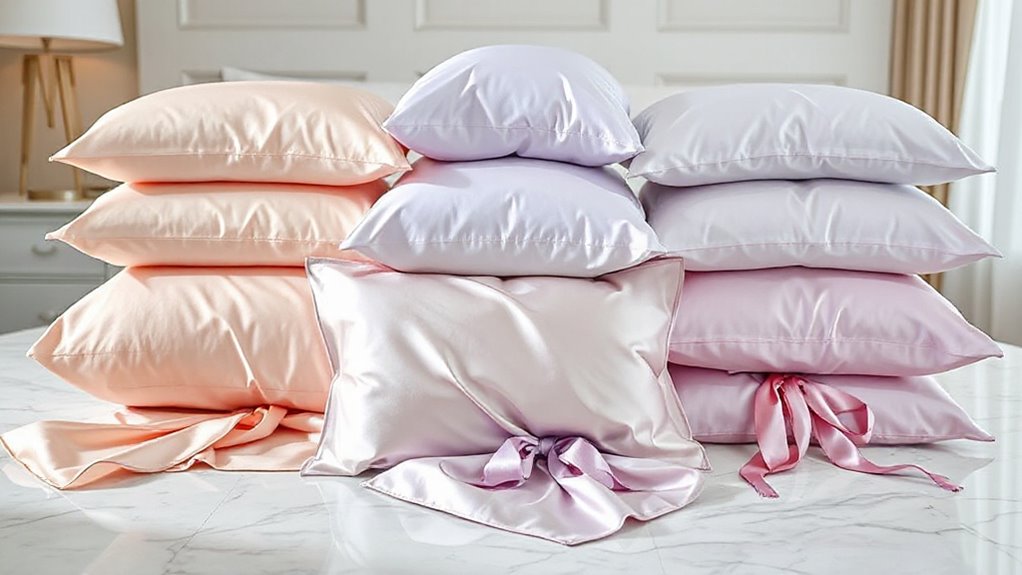 Choosing the right silk pillowcase can considerably benefit your hair and skin by reducing friction and preventing damage. Silk’s smooth surface minimizes hair breakage, split ends, and skin irritation, helping your hair stay healthier and your skin smoother. It also helps retain natural oils and moisture, preventing dryness, wrinkles, and fine lines over time. Silk’s gentle material decreases the formation of sleep lines and facial creases, supporting a more youthful look. Additionally, the natural proteins in silk promote skin cell renewal and keep your skin hydrated, resulting in a healthier, glowing complexion. Because silk is hypoallergenic and soft on sensitive skin, it reduces the risk of irritation and allergic reactions. Overall, silk pillowcases play a key role in maintaining the health and appearance of both hair and skin.