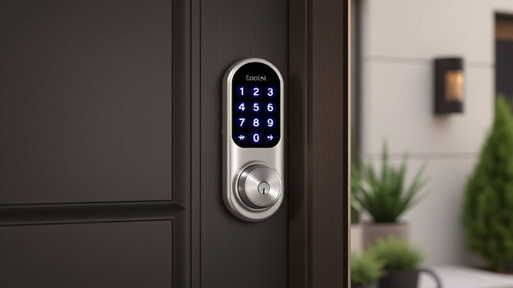 A smart lock’s app and remote control capabilities are essential for convenient and secure home access. I look for locks that let me lock or open from anywhere, as long as I have an internet connection. Real-time notifications and activity logs are crucial, so I can monitor who enters and when. Managing user access codes through the app is easy, especially if I can set temporary or scheduled codes for guests. Compatibility with voice assistants like Alexa or Google Assistant adds extra convenience, allowing voice commands for locking and opening. Lastly, I guarantee the app works smoothly with my smartphone’s operating system and that the lock offers reliable, secure connectivity to prevent any interruptions or vulnerabilities. This combination makes my smart lock both user-friendly and trustworthy.