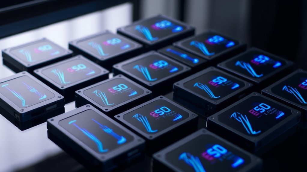 SSDs can handle a range of extreme temperatures, but their performance may decline if temperatures go beyond their specified limits. I’ve noticed that in very hot or cold environments, data transfer speeds slow down, and there’s a higher risk of hardware failure. To keep my SSD running smoothly, I always avoid exposing it to excessive heat or cold and guarantee proper cooling and insulation in harsh conditions.