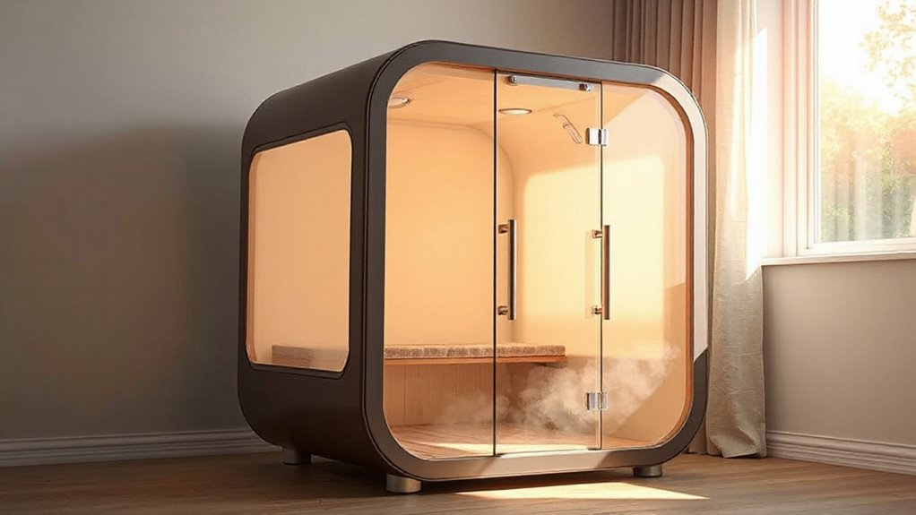 Selecting the right heating technology can considerably influence your sauna experience. Infrared heaters use rays to directly warm your body, offering quick heat and efficient penetration, perfect for faster sessions. Steam-based saunas produce moist heat by generating steam, which helps hydrate your skin and boost circulation. Most portable saunas feature electric heating elements, giving you adjustable temperature controls for personalized comfort. Some models even combine both infrared and steam systems, providing a dual approach that maximizes therapeutic benefits. Your choice impacts preheat times, energy consumption, and overall relaxation. If you want rapid warmth, infrared might be best. For a humid, skin-hydrating experience, steam-based models are ideal. Dual systems offer versatility, but they might consume more energy and take longer to heat. Consider your preferences and needs carefully.