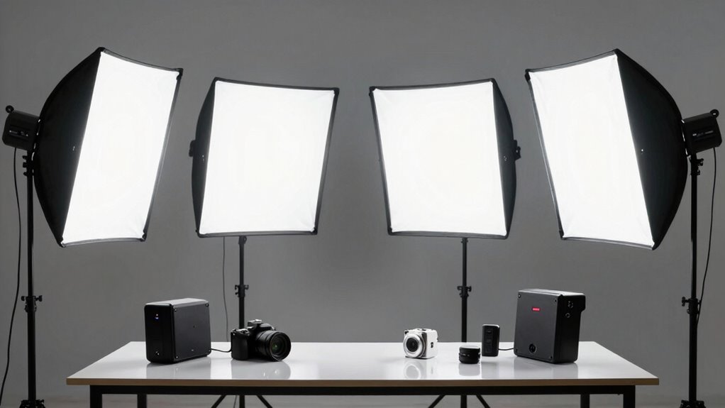 Portability and size are crucial factors that can dramatically influence how effectively I set up and use my studio lighting. Smaller softboxes, around 16 inches, are perfect for limited spaces or on-the-go shoots, while larger ones over 27 inches provide softer light but take up more room. Portable kits often feature lightweight materials like aluminum stands and compact LED panels, making transportation easier. Carrying bags or cases further enhance mobility, allowing me to move equipment effortlessly between locations. Foldable softboxes and adjustable tripods help keep the setup compact and manageable. Bigger setups, though more powerful, require more storage space and heavier stands, which can hinder quick setup and mobility. Balancing size and portability ensures I can adapt my lighting to any workspace or project.