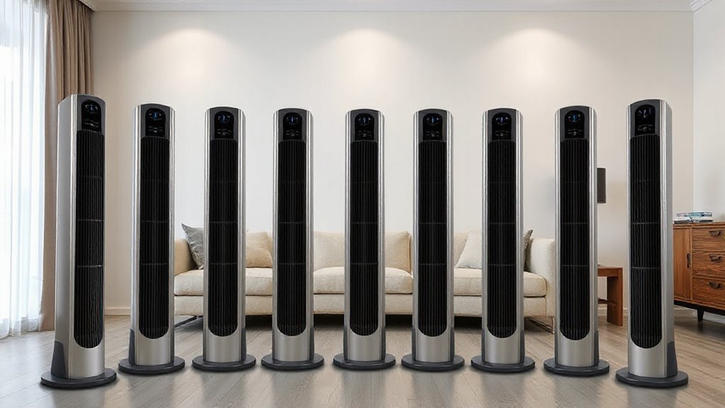 Think of premium tower fans as the guardians of safety in your home. They often include features like tip-over protection, which automatically shuts the fan off if it gets knocked over, and child lock settings to prevent accidental changes. Many also have cool touch surfaces and sturdy bases, ensuring safe operation around kids and pets. These thoughtful features make them not just effective but also worry-free companions for your comfort.
