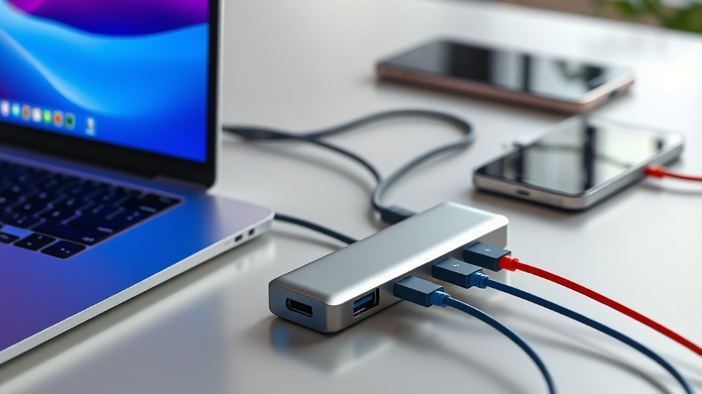 Effective port management is essential for maximizing a USB hub’s usability and efficiency. Features like individual on/off switches allow me to control power to each device without unplugging, keeping my workspace tidy and saving energy. LED indicators for each port give clear visual confirmation of active connections, making troubleshooting straightforward. Multiport hubs with dedicated charging ports let me transfer data and charge devices simultaneously, simplifying device management. Hot-swappable ports are a game-changer, enabling me to connect or disconnect devices on the fly without powering down the hub. Additionally, ports with different data transfer speeds and power capabilities require careful selection to match my devices’ needs, ensuring peak performance. These management options make my setup more organized, flexible, and efficient.