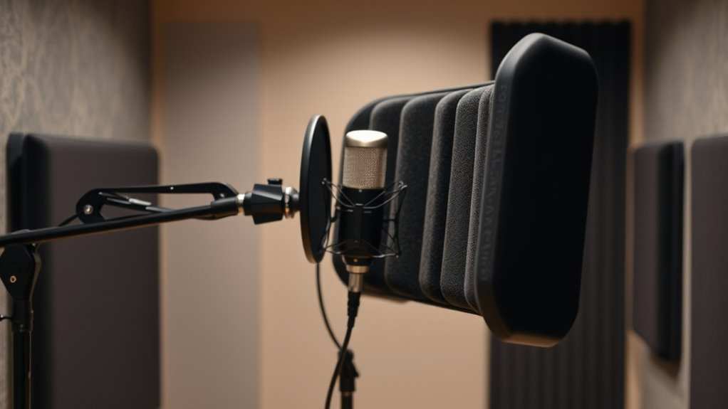 If you’re looking to improve your small studio recordings, I recommend exploring the top 15 vocal isolation shields available. These shields help block out background noise, echoes, and room reflections, making your vocals clearer and more professional. They come in various sizes, materials, and setups to suit different microphones and space constraints. Keep an eye on features like portability, durability, and compatibility. Continue on to discover more about these essential tools for better sound quality.