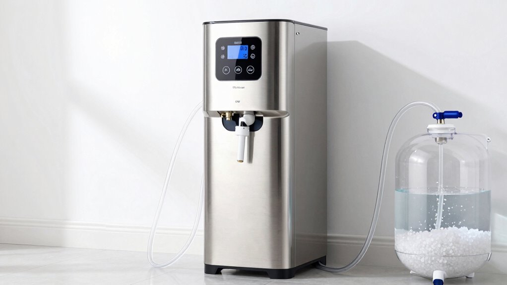 Regular maintenance is vital to keep your water softener working effectively and extend its lifespan. Most systems need periodic regeneration, either manually or automatically, to replenish resin capacity and maintain softening efficiency. Tasks like cleaning mineral buildup, replacing filters, and inspecting for leaks or damage are essential for peak performance. The frequency of maintenance varies based on water hardness and usage—some units require attention every few months, while others last several years without much intervention. Modern systems with digital controls or online monitoring can send alerts or provide data to help you stay on top of maintenance needs. Proper upkeep prevents clogs, reduces wear and tear, and guarantees you consistently get soft water throughout your home, making your investment last longer and perform better.