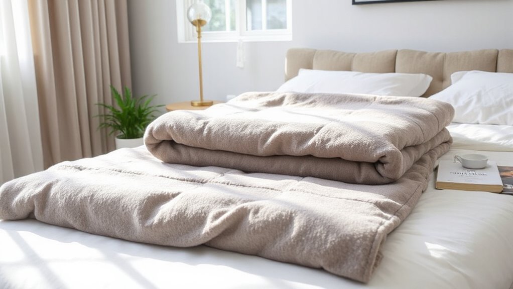 Finding the right size for a weighted blanket is essential for maximizing its calming effects. It should cover your entire body comfortably without hanging over the edges of your bed or mattress. A good rule of thumb is to choose a blanket that matches your mattress size—like 60×80 inches for a queen—or one that allows the blanket to stay in place during sleep. The blanket’s dimensions must also be proportionate to your body, ensuring even pressure distribution without causing discomfort. If the blanket is too large, it may shift or slip off, reducing its effectiveness. Conversely, a blanket that’s too small won’t provide full coverage, limiting its calming benefits. Proper sizing ensures consistent, soothing pressure and a comfortable night’s sleep.
