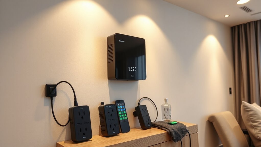 Think of your surge protector as a vigilant guardian—it’s essential to check it regularly. I recommend testing it annually using the built-in test button or a surge protector tester. Replace it every 5 to 10 years or sooner if it shows signs of wear, damage, or if it fails the test. Staying proactive keeps your home’s defenses strong against unpredictable electrical storms.