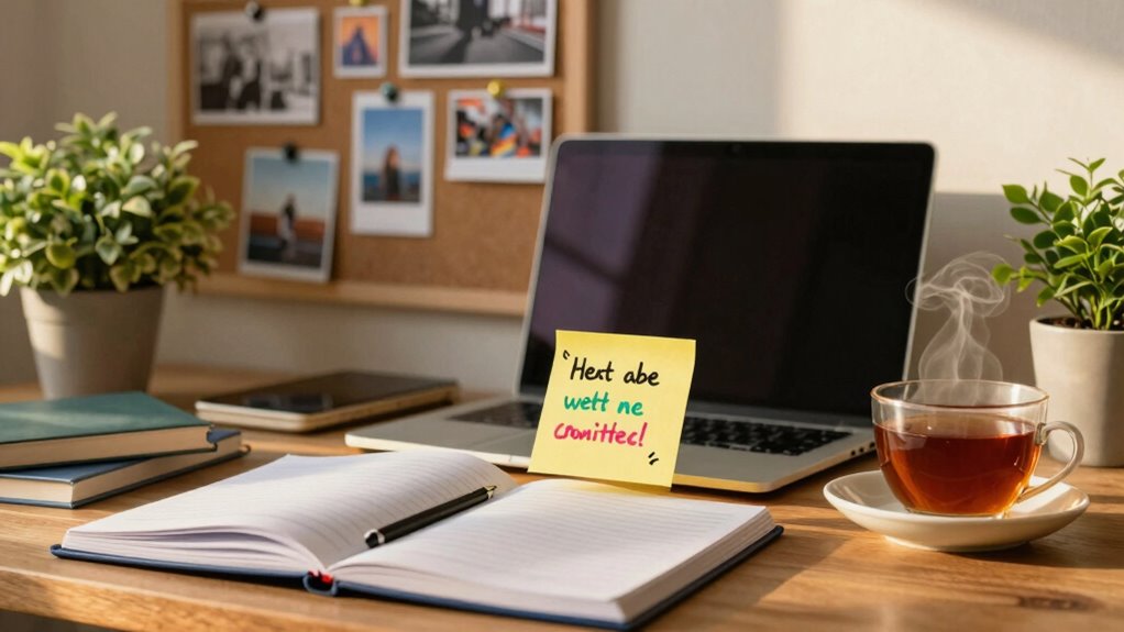 You might consider writing down your favorite quotes and placing them somewhere visible. A post-it note on your desk or a digital reminder on your phone can serve as consistent goal reminders. Each time you glance at these phrases, you’ll reconnect with your aspirations. This simple act can greatly impact your motivation, especially during challenging times. When you’re feeling lost or discouraged, those words can help you refocus and regain your momentum.