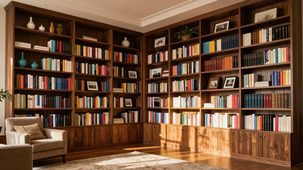 Imagine a room bursting with personality—tall bookcases excel in home offices, libraries, and living rooms. You benefit most from these spaces because your choice of bookcase materials and color coordination can add warmth or sophistication. Tall bookcases create an inspiring atmosphere, making your space feel inviting and organized. Whether you opt for rich woods or sleek metals, their height emphasizes your style while maximizing storage.