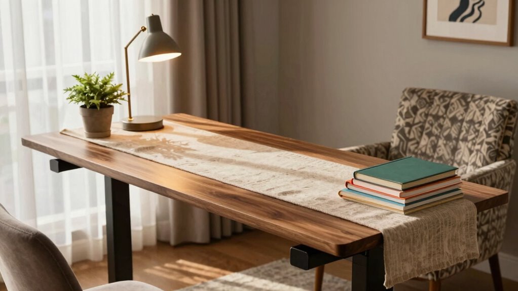 Lighting also plays an essential role in achieving a warm, personal vibe. If possible, position your desk near natural light, or add a stylish desk lamp that complements your decor. Soft, warm lighting can make the space feel more inviting and reduce eye strain. Combining these elements—ergonomic accessories, decorative plant accents, personal items, and thoughtful lighting—transforms a simple standing desk into a personalized haven. You’ll find that a well-styled workspace keeps you motivated and comfortable throughout your workday, blending practicality with personality effortlessly.
