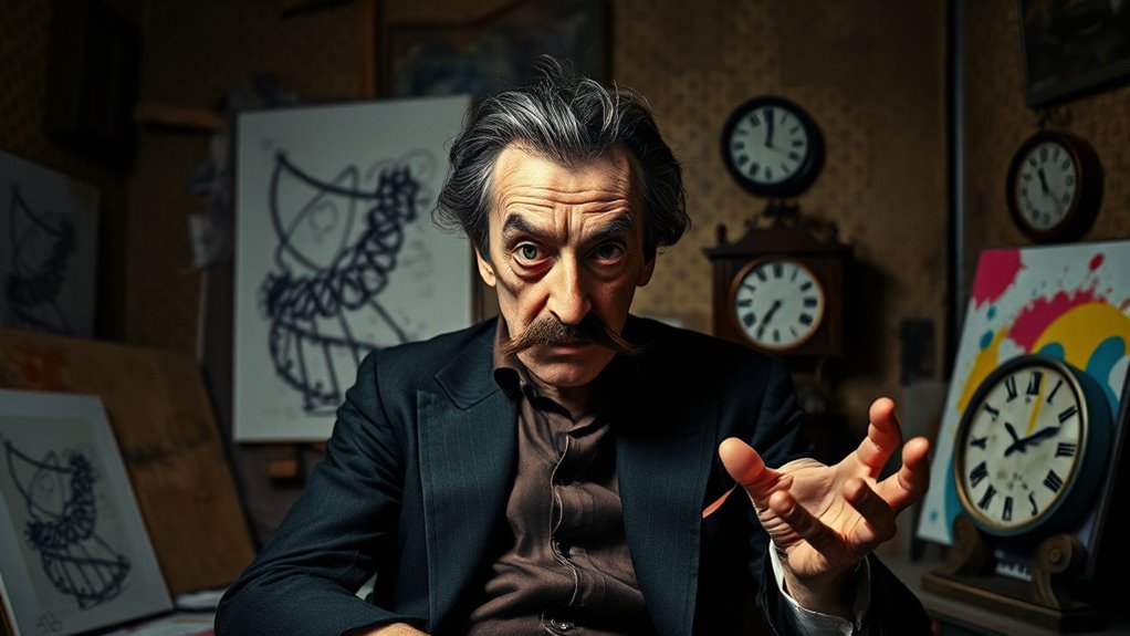 Your personal life is like a mirror reflecting in Dali’s surrealist art, shaping its dream symbolism and emotional depth. His struggles with mental health, relationships, and fears fuel his vivid imagery, making his work a window into his inner world. Through this lens, you see how his experiences transformed everyday objects into symbols of his personal battles, turning his art into a powerful expression of his complex inner life.