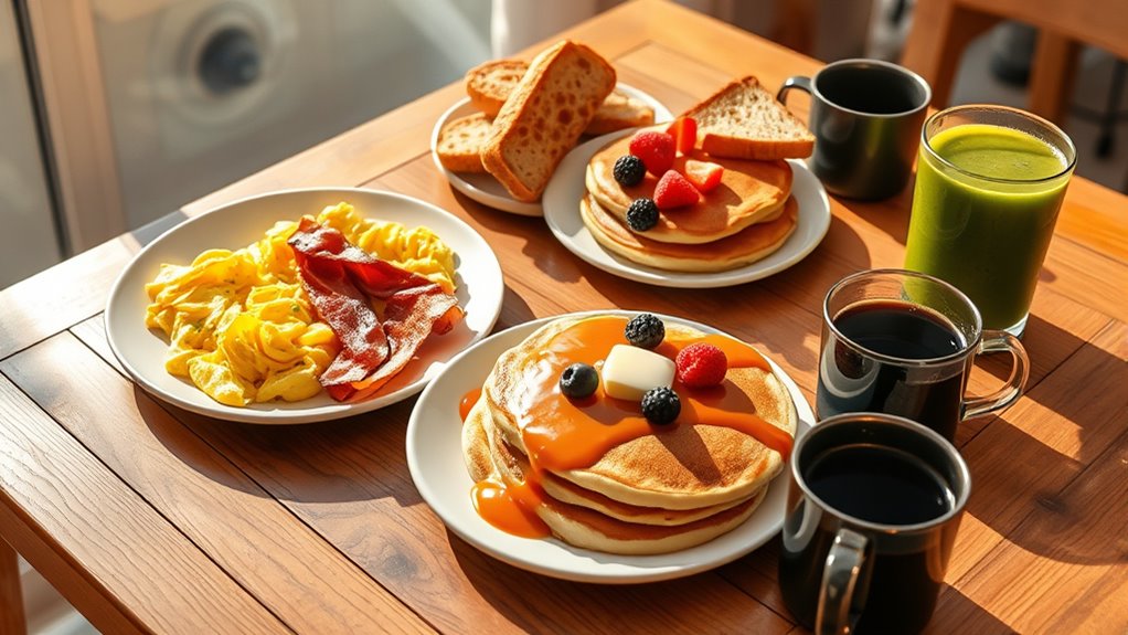 Oh, the joy of dietary restrictions—making breakfast a delightful puzzle! If you’re gluten-free, you’ll love options like fruit salads or gluten-free muffins that keep your mornings bright. Vegan? Think tofu scramble or avocado toast—delicious and cruelty-free. Restrictions definitely challenge your breakfast choices, but they also open doors to creative, tasty alternatives that prove you don’t need gluten or eggs to start your day right.