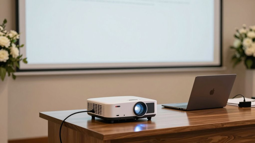Using a projector at a memorial service can be a meaningful way to honor and remember a loved one, but there are essential factors to take into account beforehand. One of the first considerations is guaranteeing the lighting adjustments in the space are suitable for projecting images or videos clearly. Bright lighting can wash out images, making them difficult to see, so you’ll want to dim the lights or turn off any unnecessary sources. This creates an environment where the projector’s display is vivid and easily visible to everyone in attendance.