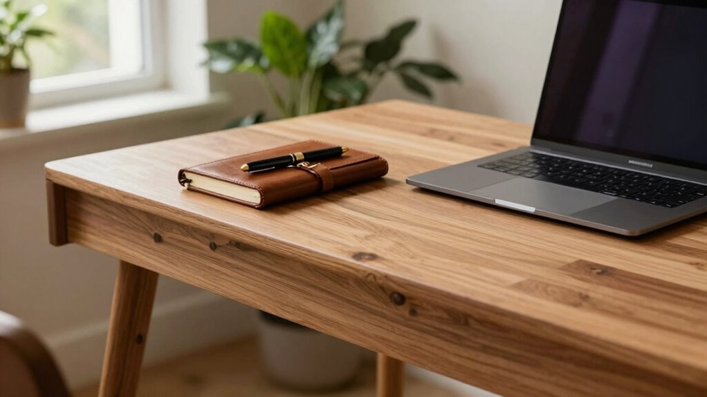 Like Icarus seeking balance, you need ergonomic materials that elevate your comfort without risking a fall. Opt for desks with adjustable components, made from materials like bamboo, which is both sustainable and supportive, or high-density foam padding for comfort. These comfort-enhancing features help reduce strain and fatigue, making your workspace more efficient and health-conscious. Choosing the right materials guarantees your workday remains productive and comfortable.